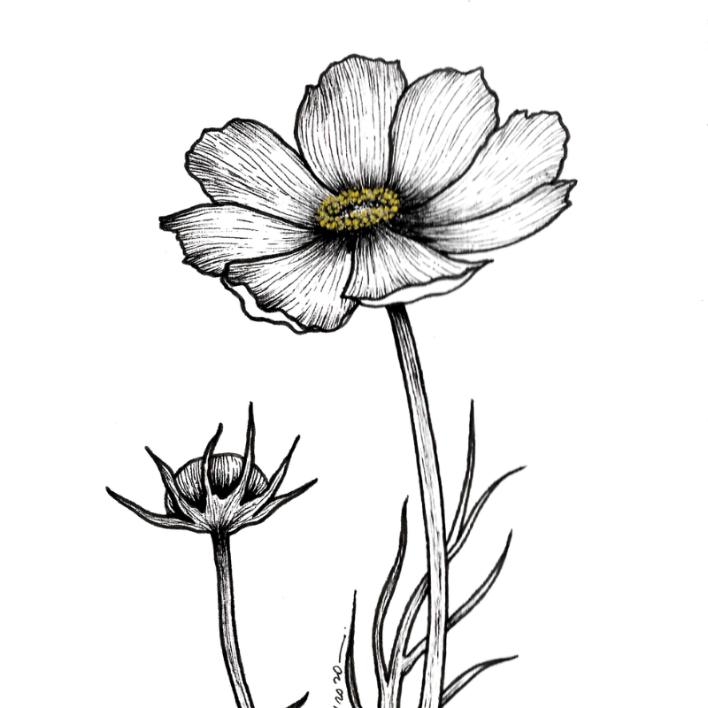 Floral ink illustrations are a visually appealing artform. In fine art, the term 'pen and ink' denotes a drawing technique involving the use of black and other coloured inks which are applied to a support (generally paper) with either a dip pen or a reservoir pen.
