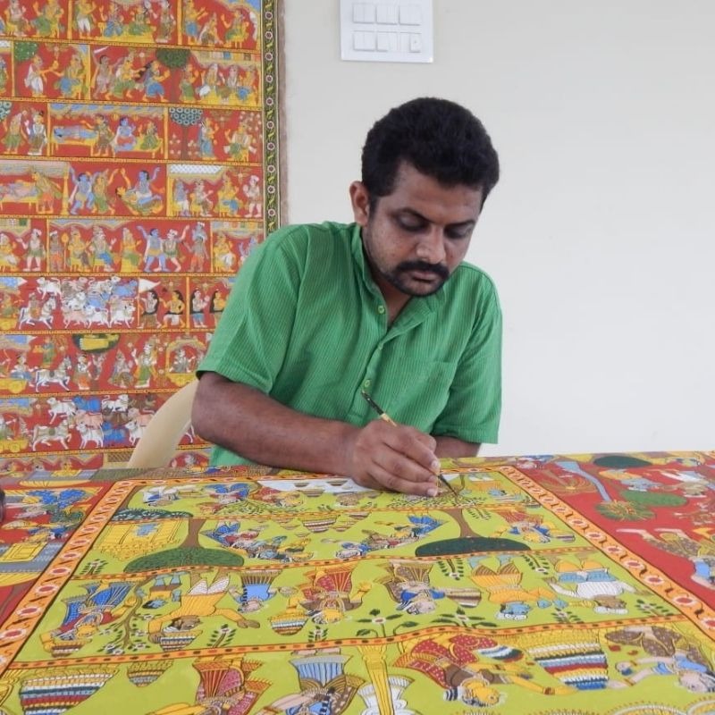 Dhanaloka Saikiran Varma (BFA, STATE AWARD MASTER CRAFTSMEN IN CHERIAL SCROLL PAINTING AND MASKS) son of state award winners D. Nageshwar and D. Padma, hails from Hyderabad, Telangana. He completed his Fine Arts from Sri Venkateshwara College of Fine Arts, Madhapur. Later he chose to carry on with his family tradition of Cherial Scroll Painting and Mask Making. He has conducted multiple workshops across the country.