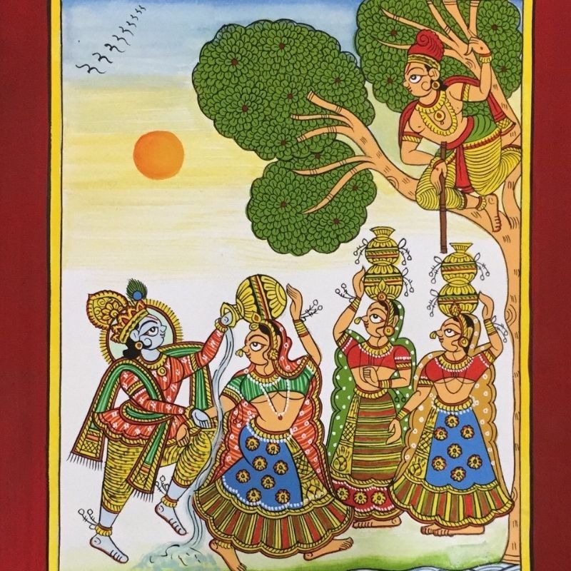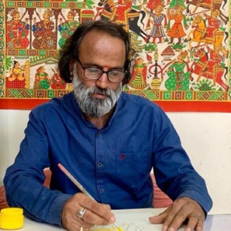 Shri Kalyan Joshi comes from a long line of Phad painters, dating back to the thirteenth century. He started painting at the age of eight with his father, Shri Lal Joshi, an acclaimed Padma Shri honoree. Kalyan Joshi Ji experiments with new stories, contemporary style painting, and line drawing and has received numerous awards across his career, including the National Award from the Government of India in 2010, the National Merit Award by the Government of India in 2006, and the Gauri Shankar Mehta Award, Maru Parampara in 2008.