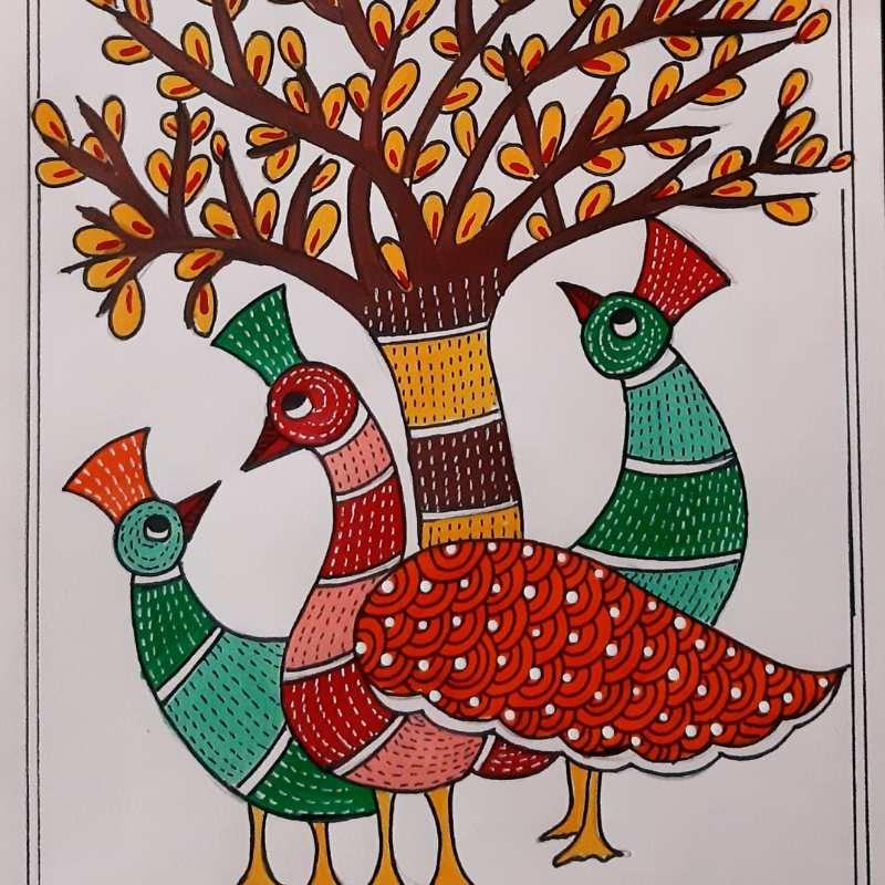 Gond Art is a traditional art form of the Gond Tribe of central India. They make paintings of nature like trees and animals like peacocks, deer as they think it envokes prosperity.