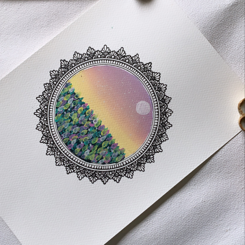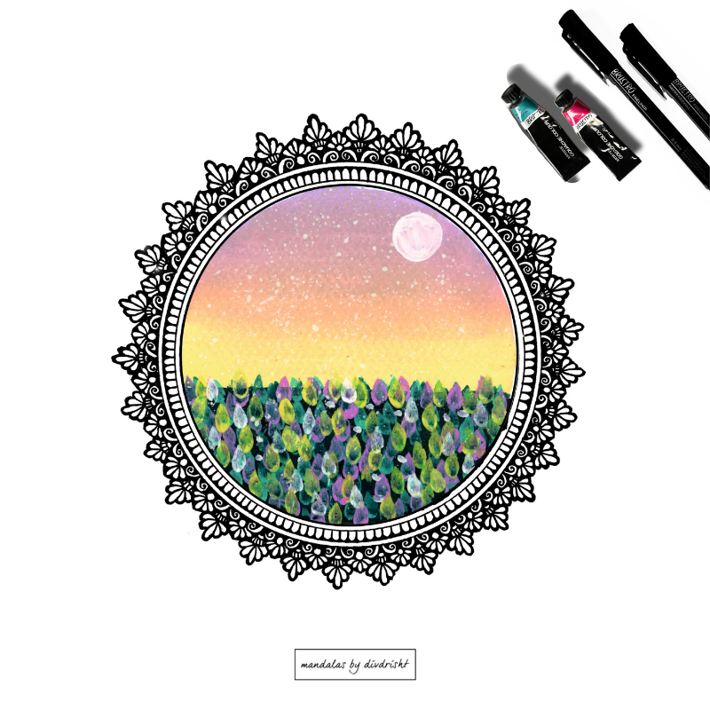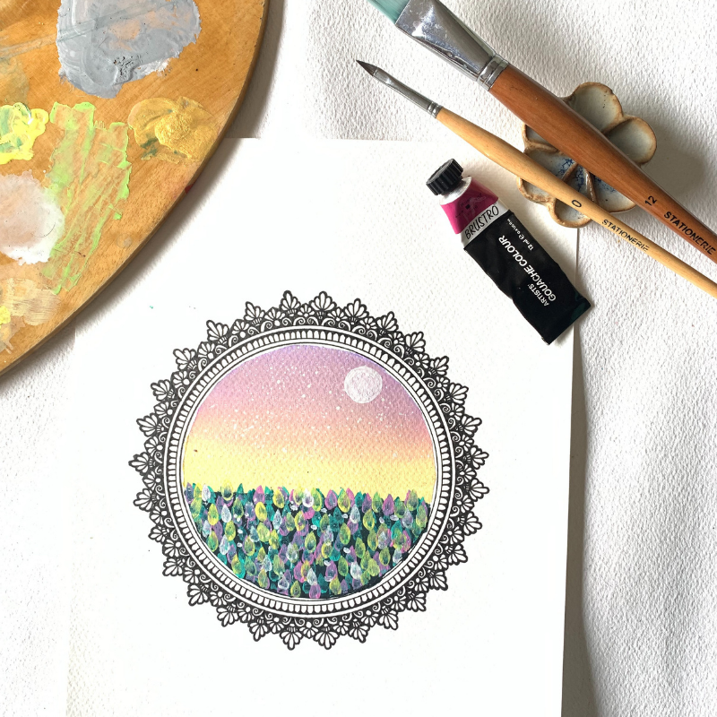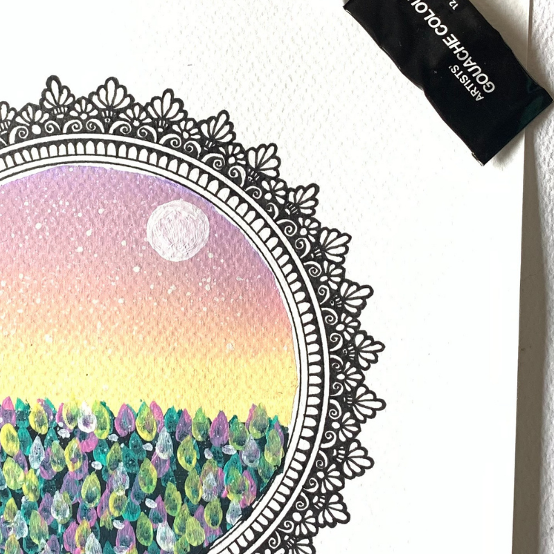 Gouache is an opaque water-medium paint consisting of natural pigment, water, a binding agent and sometimes additional inert material. It is generally used by commercial artists for posters, illustrations, comics, and other design work. Mandala art is a therapeutic art form and has its origins rooted in sacred history. Combining gouache with the geometrical design of Mandalas will result in a gorgeous fusion of these artforms.