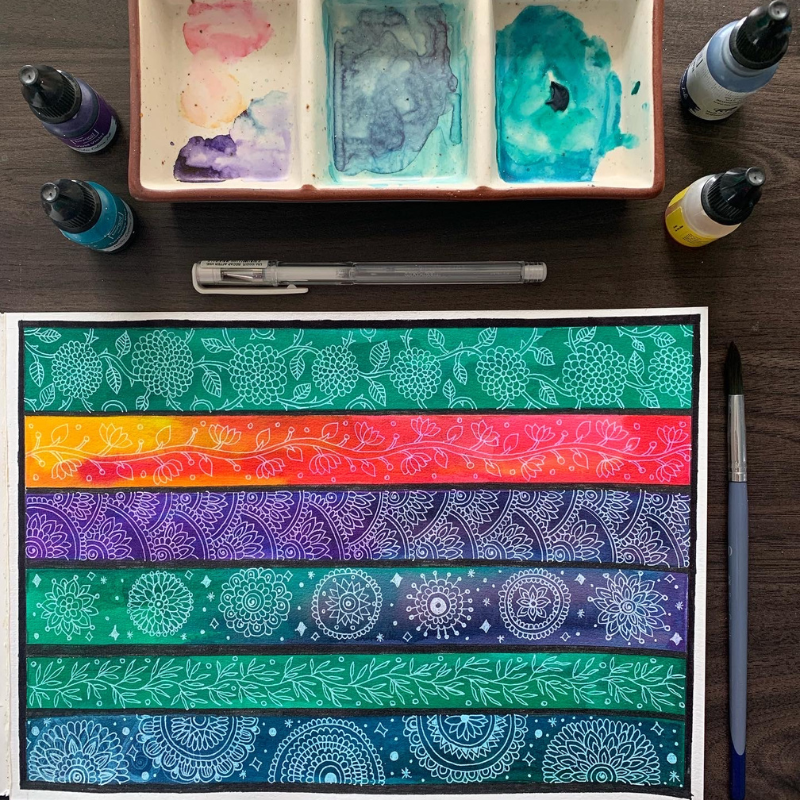 In this session, you will learn about the age-old art form in a much more familiar way, starting with an introduction to creating beautiful border artwork. You will lay a watercolor wash in different colors to create gorgeous blends and galaxy-like effects and using a white gel pen, draw beautiful floral and doodle patterns. All of the mentioned will be taught in a way to provide you with a complete hands-on experience of the art form by the end of the workshop.
